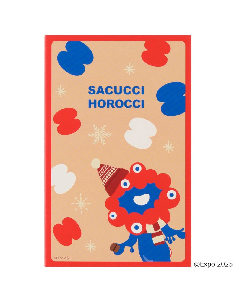 ミャクミャク初めての冬体験!あったかマフラーと帽子を身にまとった今までないミャクミャクの冬デザインと、シーキューブのサクッチ・ホロッチを手に持った特別なパッケージでご提案。遊び心あるカラフルなデザインとシーキューブのサクッチ・ホロッチがマッチした、お土産にもご自宅用にもピッタリなデザイン。個包装フィルム上はミャクミャクの後ろ姿が可愛い三角形のデザインです。