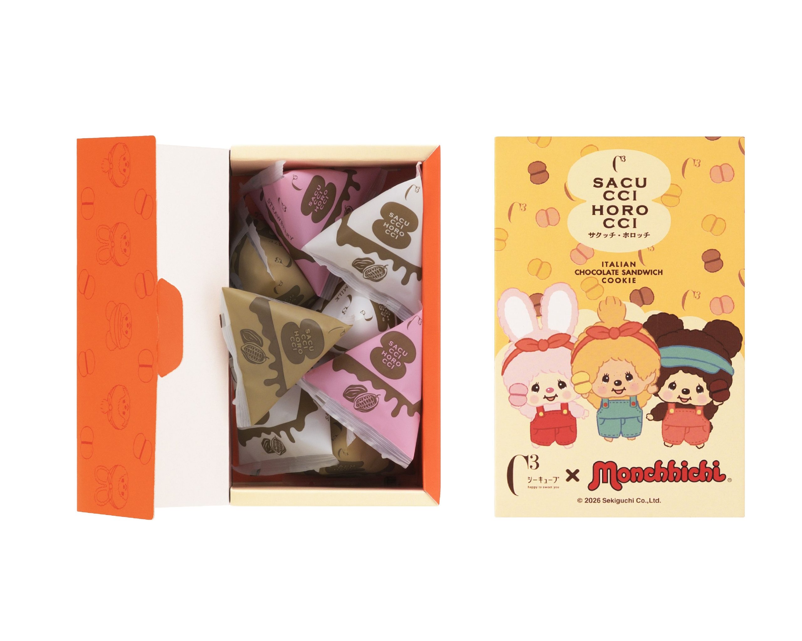 サクッチのかわいらしさとフレーバーにぴったりの3人組で、コロンとかわいいコラボレーションを表現しました。背景のパターンにはサクッチと、側面にはモンチッチのお顔も入れ込み、見ていて楽しさを感じてもらえるようにしました。フタをあけても、中にキャラクターが座っている遊び心のあるしかけをしています。